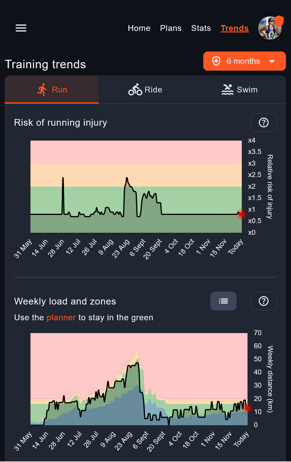 Use the planner to schedule your runs, rides, and swims. Aim for the green zone to keep training safely.